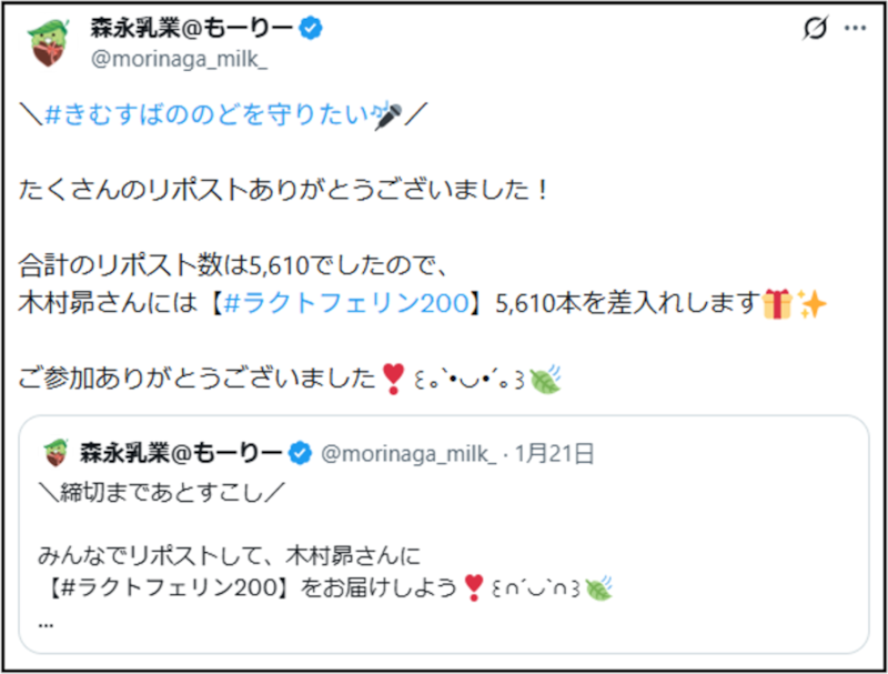 森永乳業の公式Xアカウント「@もーりー」にて、指定のキャンペーン投稿がリポストされるごとに、その数に応じた本数の「森永ラクトフェリン200ドリンクタイプ」が木村昴さんへ実際に差し入れされる内容となっており、キャンペーンには木村昴さんの“のどを守りたい”という想いに共感した多くの方々がリポストを実施。