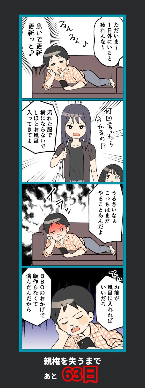 同僚の前では率先して動き、育メンアピールも大成功。……だったはずの夫ですが、帰宅するなり一目散に横になります。