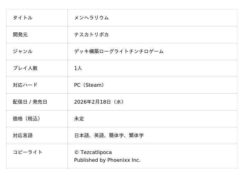 株式会社Phoenixx(フィーニックス)(東京都武蔵野市、代表取締役社長:坂本 和則)は、デッキ構築ローグライトチンチロゲーム『メンヘラリウム』をSteam(PC)向けに、2月18日(水)より配信開始を決定したことをお知らせいたします。