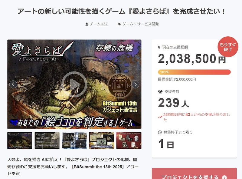 UZZが開発の存続をかけてCAMPFIREでクラウドファンディングプロジェクトを公開中のインディーゲーム「愛よさらば」。9月30日23時59分のプロジェクト終了を目前に、目標支援金額200万円のゴールを達成しました。