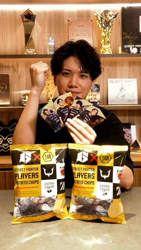 本商品は、株式会社湖池屋が展開するポテトチップスと『ストリートファイター6』のコラボレーション商品であり、同タイトルの競技シーンで活躍するトッププレイヤーたちをデザインしたオリジナルカードがランダムで封入されたアイテムです。ポテトチップス(うすしお味)1袋につき、選手のオリジナルカード(全40種)がランダムで1枚封入されており、ゲームファン・eスポーツファンの皆さまにお楽しみいただける内容となっています。