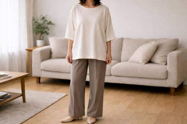 トップスをそのままアウトで着るスタイルは体型を隠せる反面、縦のラインが途中で分断されやすく、ウエスト位置が曖昧になりがちです。