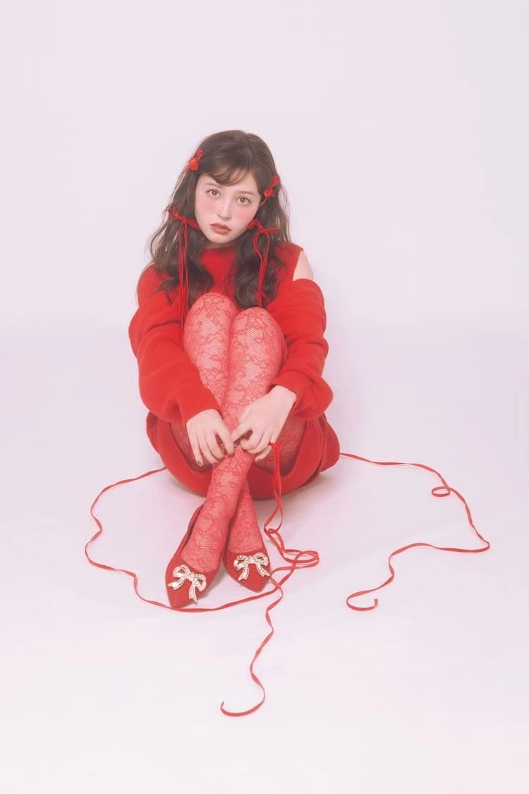 レースタイツなどの足元の透け感で強くなりがちな赤の主張を引き算。