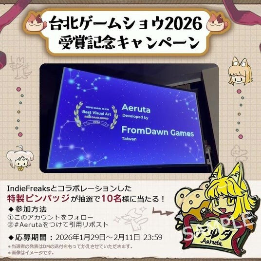 今回の「ベストビジュアルアート賞」大賞受賞を記念し、公式Xアカウント(@Aeruta_official)にてインディーゲーム専門サイト「Indie Freaks」とコラボした特製ピンバッジが10名様に当たるキャンペーンを開始いたしました。