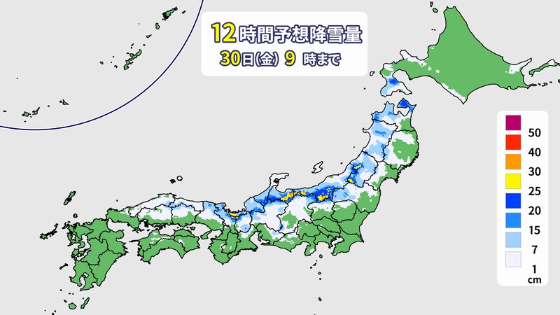 日中は雪が降ったり止んだりでしょう。30日(金)の朝にかけて10~20センチくらい積もりそうです。
