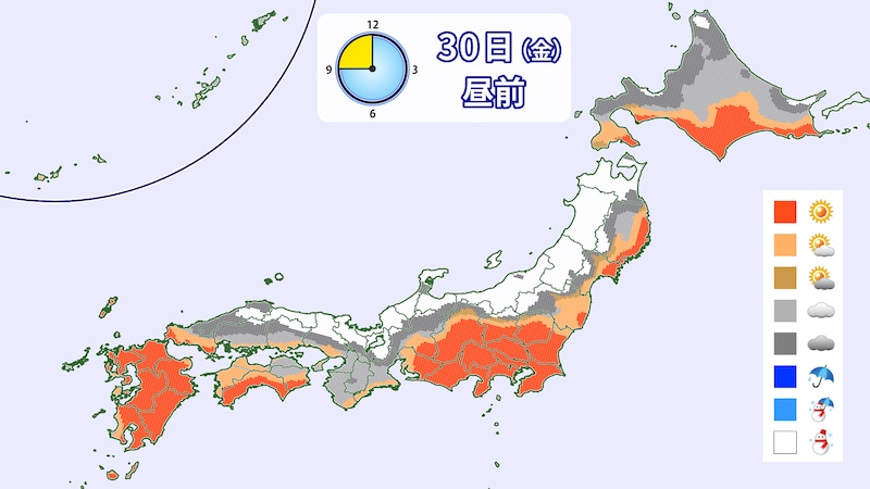 午前中は冬型の気圧配置が緩み、くもりや晴れとなるでしょう。29日(木)から30日(金)朝にかけては、道南、函館周辺では少し積もりそうですが、あまり降らない見込みです。30日(金)の夜は日本海側で雪が降るでしょう。