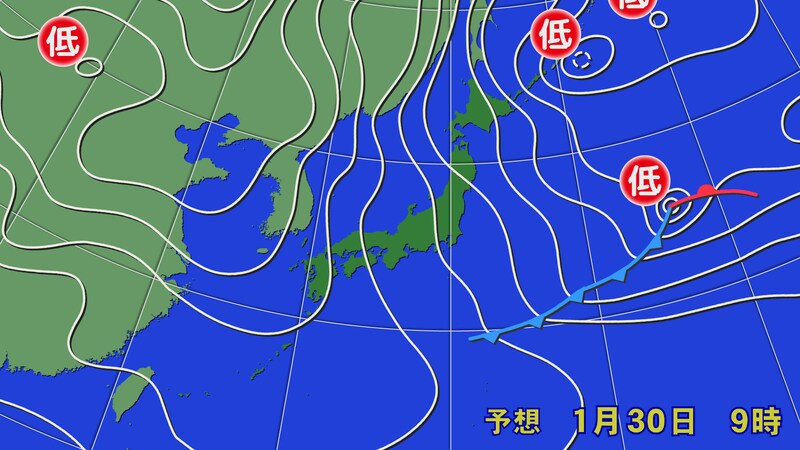 30日(金)は東圧線の間隔が狭まり、冬型の気圧配置が強まる見込みです。29日(木)の夜も日本海側の山沿い中心に雪が積もるでしょう。30日(金)は、JPCZ(日本海寒帯気団収束帯)は弱まりながら近畿から山陰を指向する予想です。北海道の渡島半島や東北北部は、小低気圧やシアラインの影響で大雪となる所がある見込みです。