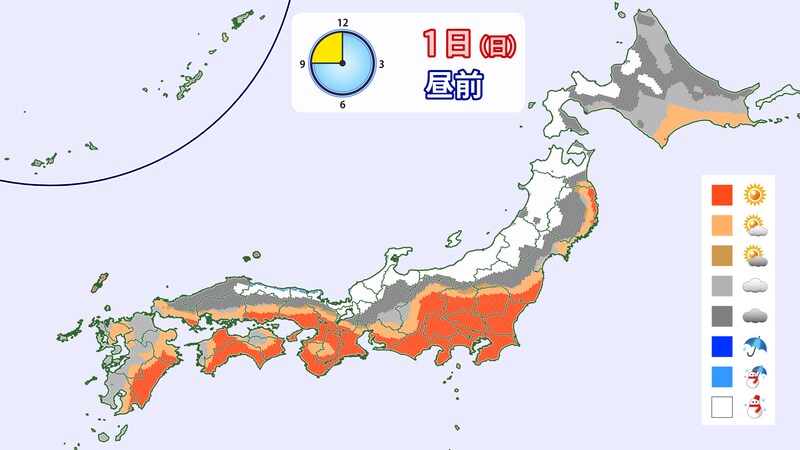 1日(日)の朝にかけてうっすら積もる所はありそうですが、日中は晴れやくもりとなるでしょう。
