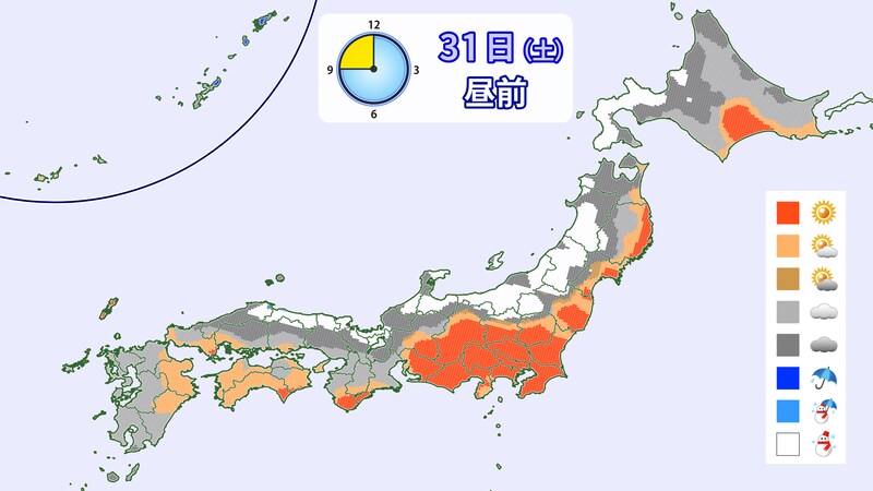 31日(土)は、西日本には高気圧が張り出し、雪は止んでくるでしょう。一方、東日本や北日本は冬型の気圧配置が続き日中も雪が降るでしょう。ただ、上空の寒気は抜けていくので、それほど強く降ることはなさそうです。