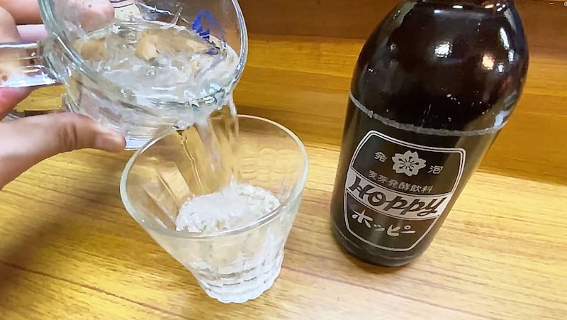 コップに焼酎を移して飲むホッピー。