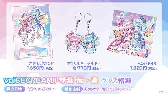 企画第1弾として、音声合成キャラクター×アイスクリームをコンセプトにした「voiCECREAM!!」より琴葉 茜・葵各グッズ、また”ちっちゃくて可愛い音“をイメージしてキャラクターをぬいぐるみ化する「TunyTune」より人気の合成音声キャラクター「さとうささら」「すずきつづみ」「タカハシアマト」のぬいぐるみを販売します。「TunyTune」では3人のセットにポストカードの特典がつく「フレンズセット」も限定販売します。第2弾以降の企画も進行中です。Colormallの今後の広がりにぜひご期待ください。