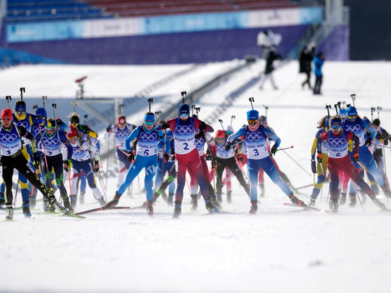 オリンピックのバイアスロンは、男子20kmインディビジュアル、女子15kmインディビジュアル 、男子10kmスプリント、女子7.5kmスプリント、男子12.5kmパシュート、女子10kmパシュート、男子15kmマススタート、女子12.5kmマススタート、男子4×7.5kmリレー、女子4×6kmリレー、混合4×6kmリレー(男子+女子)の計11種目。種目に応じてミスショット1発ごとに1分のペナルティタイムが加算されるか、ペナルティループを走る必要がある。