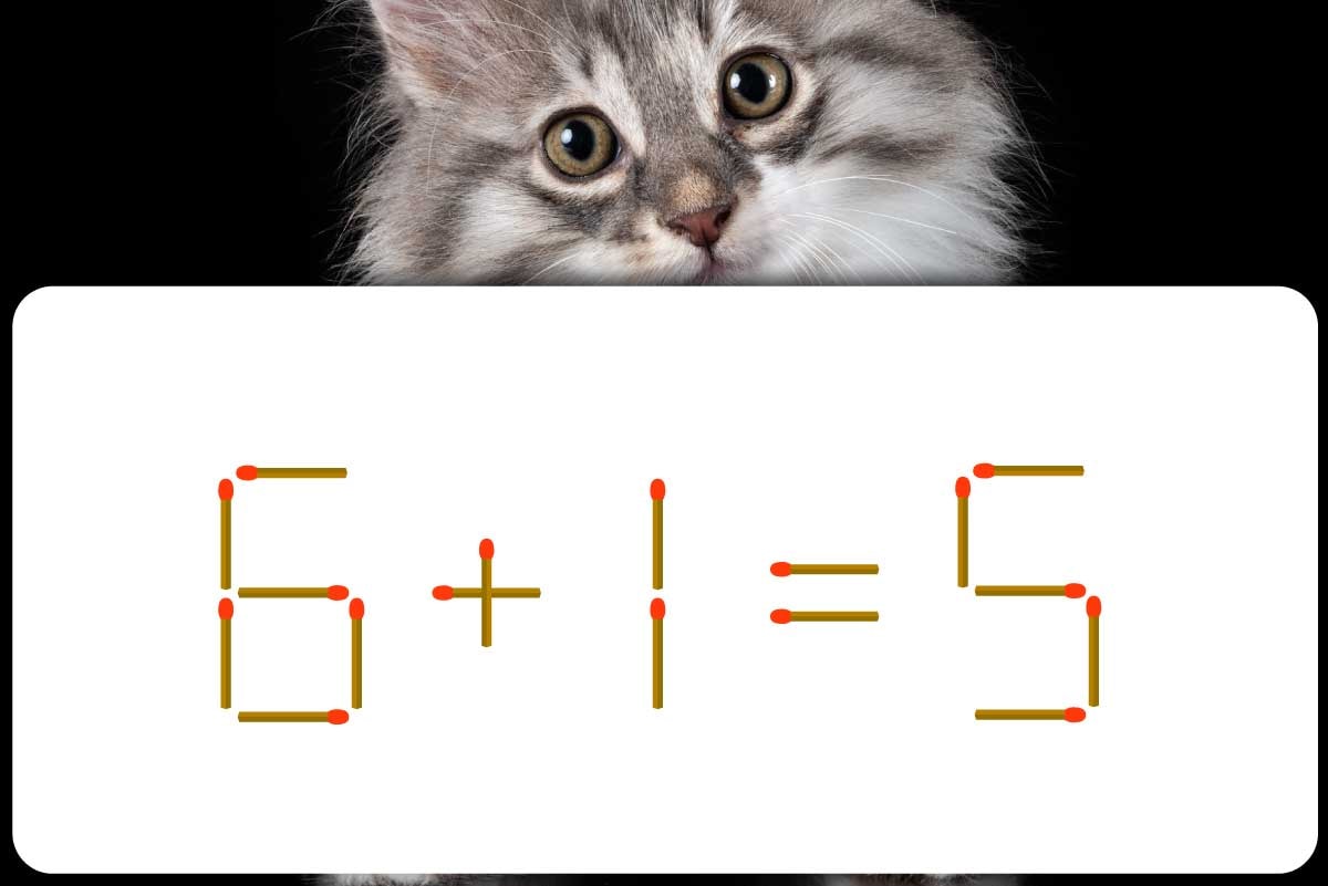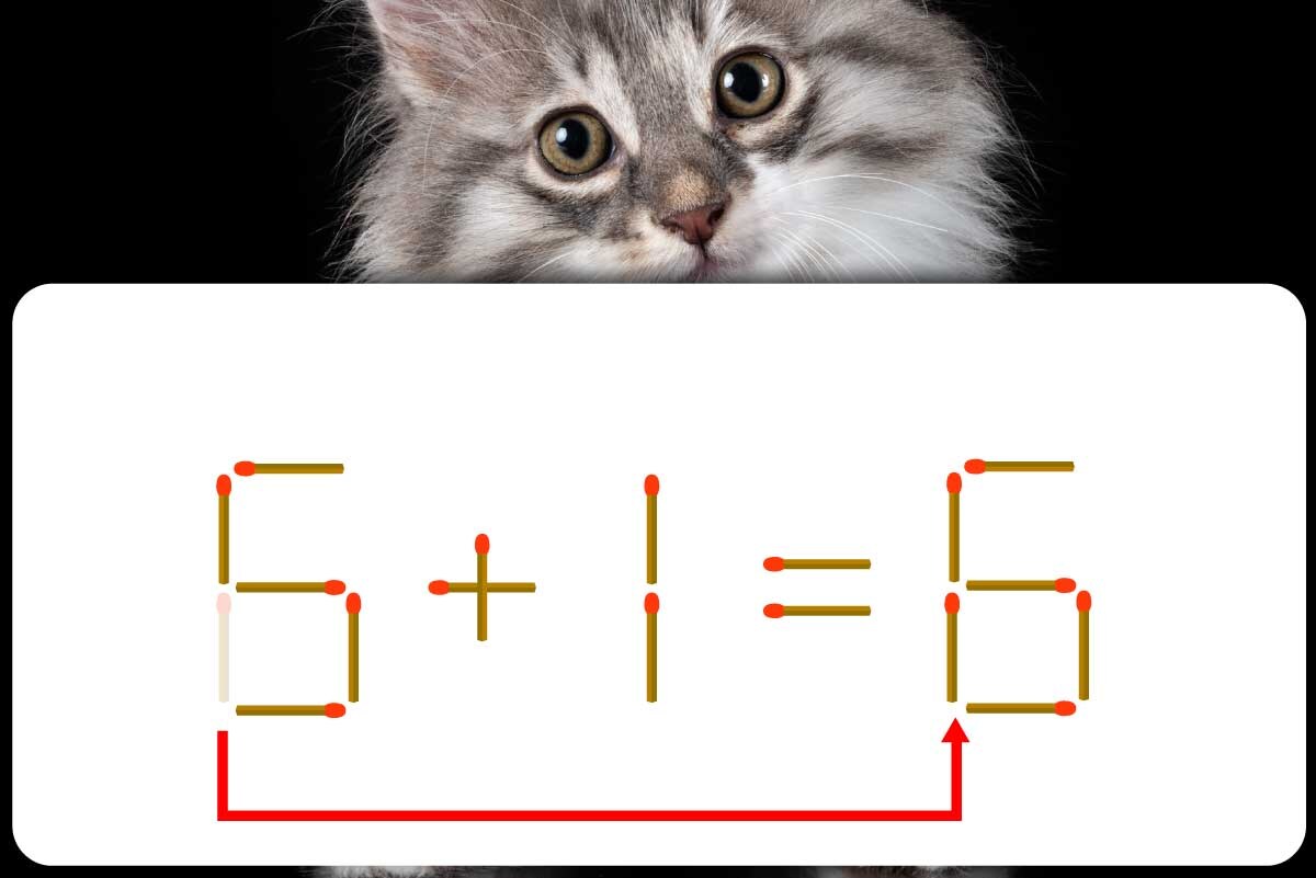 まず「6」から、左下にある縦向きのマッチ棒を取り、数字を「5」にします。そうして答えにある「5」の左下にマッチ棒をはめこめば、数字が「6」に変身しました!すると式が「5+1=6」になり、完璧に答えが一致します。