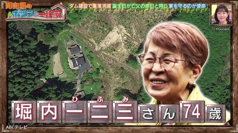 女性は中学を卒業した後に、岡山県内の縫製工場に就職。20歳で結婚し津山市へ移り、3人の子宝に恵まれたが、末娘が高校を卒業した後に離婚。病院で介護士として働きながら1人で暮らし、14年前60歳で病院を退職したのを機に、80歳を超えた両親を介護するため、この「ダムの上のポツンと一軒家」に戻ってきた。
