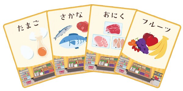 スーパーマーケットに並んだ裏向きの食材カードをめくりながら、自分の「おかいものカゴ」に集めていくことが目的です。