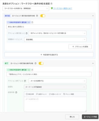 ナレフルチャットのAIエージェントでは、「勤怠関連のワードが出たら【A】のアクション、人事や評価については、【B】のアクション」といった自然言語(普段の話し言葉)で判定条件を入力するだけで、AIがその意図を理解し、分岐設定が完了します。