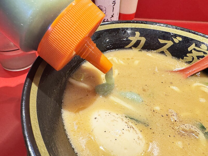 地味に感動した点が、カズ家のラーメンは、調味料を入れて味変したとしても、味が崩れない点。