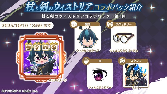 ウィル、エルファリア、シオンになりきれる髪型や目パーツ、アクセサリーやオリジナルスタンプなどが入っている期間限定パックが登場!