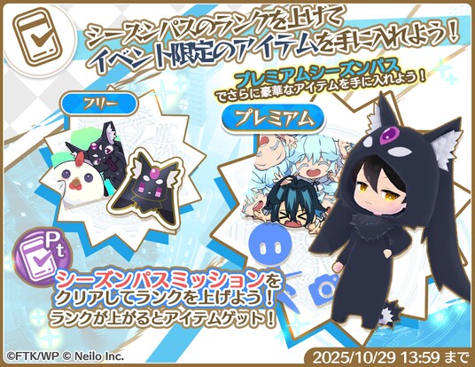 シーズンミッションをクリアし、シーズンパスのランクを上げることでイベント限定アイテムがもらえます。【プレミアムシーズンパス】を購入すれば、さらに豪華なコラボアイテムが手に入るチャンス!