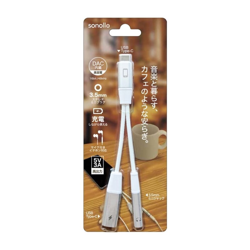 「Sonollo」は、USB Type-C端子を3.5mmイヤホンジャックへ変換するDAC内蔵アダプター。3.5mm端子に加え、充電専用のUSB Type-C端子を備え、音楽を楽しみながらスマートフォンの充電が可能だ。USB充電が利用できるカフェや喫茶店で、読書や勉強をしながら音楽を聴きつつ充電する——そんな“音楽と暮らす時間”を快適に支える。