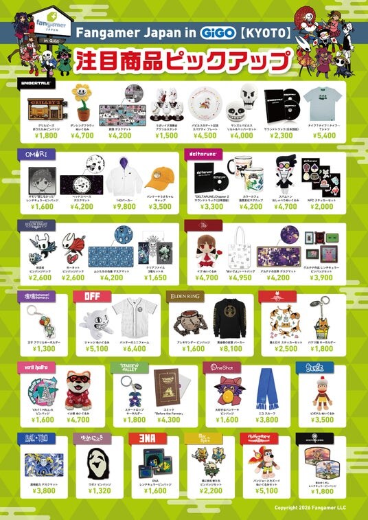 同店は、「GiGO河原町オーパB1F」内に常設店舗としてオープンします。店内ではゲームファンの目線で企画したゲームグッズを販売。さまざまなゲームタイトルグッズを取り揃えています。さらに店内には「Fangamer Japan in GiGO【KYOYO】」専用に、和装キャラクターを描き起こした大型キービジュアルのフォトスポットも登場します。
