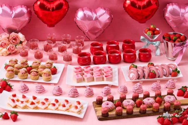 スイーツラインナップは、ランチ20種・ディナー21種。ランチ・ディナーともに、新鮮ないちごを好きなだけ味わえる「こぼれいちご」や、ディナー限定で「ミル・ミルサントノーレ」が登場。美しいサントノーレタワーに、思わず歓声があがりそう。「いちごのミニパフェ」やオリジナルで作り上げる「ペインティングクッキー」、焼き立ての「ホワイトチョコ入りいちごガナッシュフォンダンショコラ」など、注目メニューが満載です。