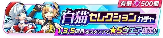「モンストセレクションガチャ」からは三途(CV:井口裕香)、カエサル(CV:高山みなみ)の2キャラクター、「白猫セレクションガチャ」からアイリス(CV:堀江由衣)、シャルロット(CV:内田真礼)の2キャラクターが登場します。本ガチャから排出される★5ウェアは、上記のキャラクターのウェアのみとなっております。また、本ガチャは有償ジュエル500個限定で5回までまわすことができ、1回目、3回目、5回目のスタンプでは★5ウェアが確定となります。それぞれのキャラクターは限定ウェアも登場します。