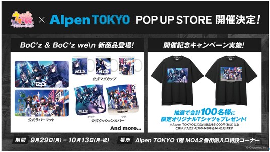 スポーツ用品販売の株式会社アルペン(本社:愛知県名古屋市、代表取締役社長:水野敦之)は、株式会社Cygamesが提供する大人気ゲーム『ウマ娘 プリティーダービー』(以下、ウマ娘)の、「BoC'z」&「BoC'z we¥n」の新商品を含む各種アイテムをAlpen TOKYO内POP UP STOREにて販売します。POP UP STOREは9月29日(月)から10月13日(月・祝)の期間限定でオープン。店内は特別な装飾で彩られ、「BoC'z we¥n」の世界観を楽しむことができます。また、POP UP STORE開催記念として限定オリジナルTシャツが抽選で当たるキャンペーンも同時開催します。