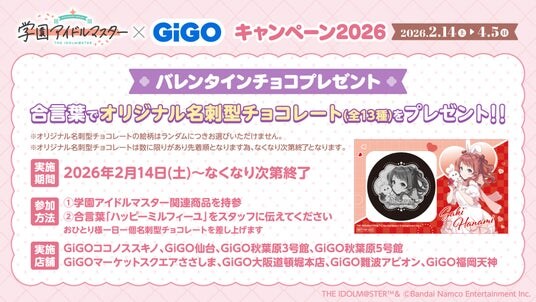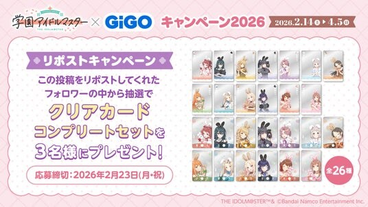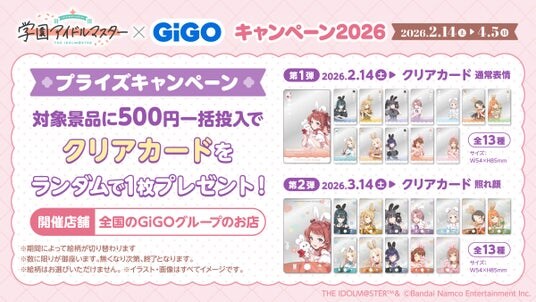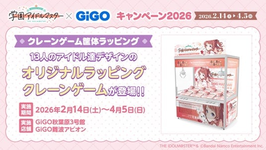 株式会社GENDA GiGO Entertainment(本社:東京都港区 代表取締役社長:二宮 一浩、以下「当社」)は、GiGOグループのお店におきまして、『アイドルマスター』シリーズの最新作、歌とダンスが上手くなるアイドル育成シミュレーションゲーム『学園アイドルマスター』とコラボした「『学園アイドルマスター』×GiGOキャンペーン2026」を2026年2月14日(土)より開催いたします。