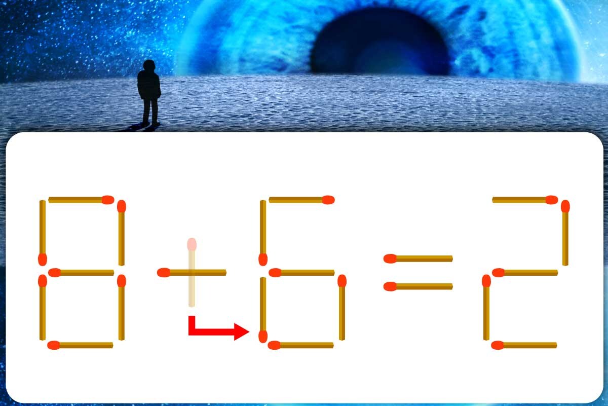 「+」のマッチ棒を1本、「5」に移動させて「6」を作り「8-6=2」にする。※解答は複数ある場合があります。