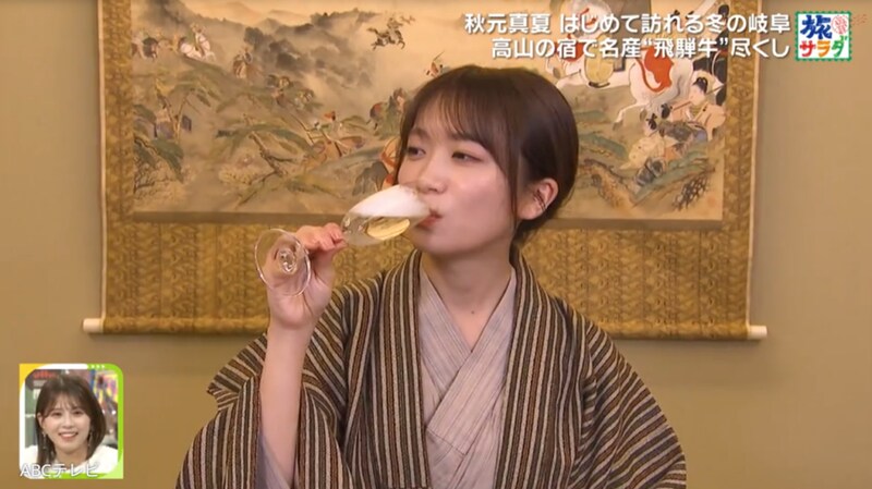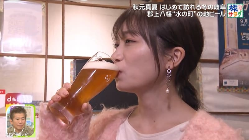 『朝だ!生です旅サラダ』では、秋元が冬の岐阜県を旅したVTRが公開された。実は彼女は、「毎晩必ず1杯は飲む」というほどビールが大好き。郡上八幡の名水仕込みクラフトビールを昼から味わった秋元は、「おいしいっ!」と瞳を輝かせて感激! 「深みだけじゃなくて、ちょっとふわっとした華やかな感じとか、柔らかさもあって、すごく飲みやすいのに飲みごたえみたいなものもあります!」と的確にリポートした。