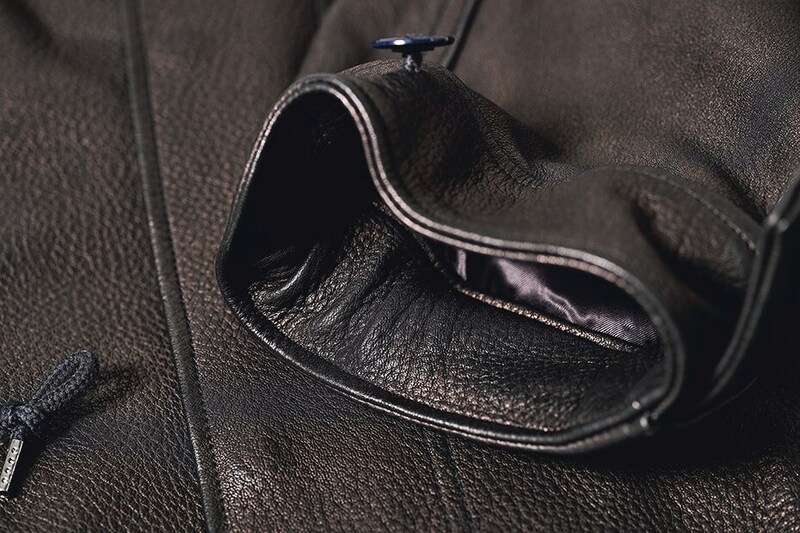 ミリタリーの大定番であるM-65フィッシュテールパーカを鹿革で再構築した「ルテール」。大判のディアスキンの丸革を贅沢に使用しており、フロントなどは継ぎの無い1枚革仕様となっている。鹿革でありながら、オリジナルのディテールを忠実に再現している点も見逃せない。このルテールは421,960円だが、他にレザー製のライニング(269,940円)と、レザー製のフード(218,900円)をラインナップ。(ファインクリーク http://www.finecreek.jp)