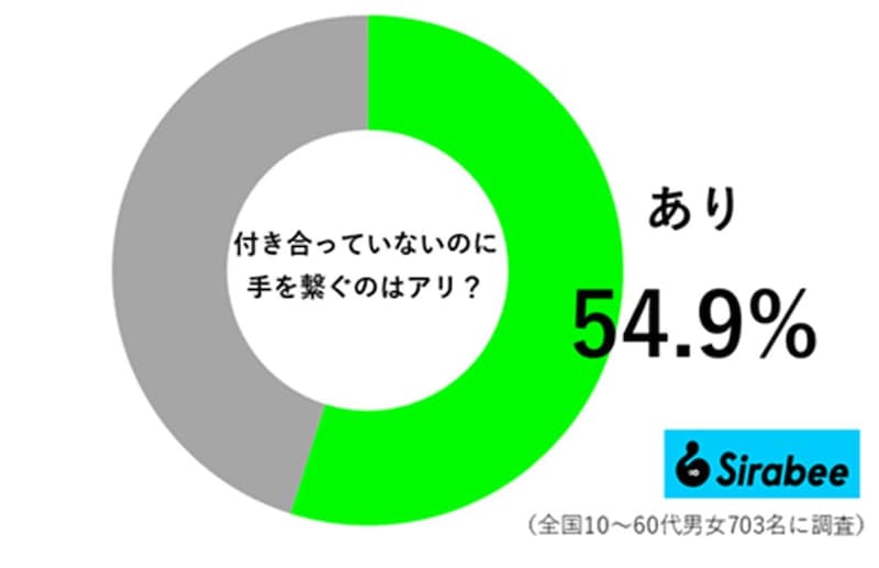 ■付き合っていないのに手を繋ぐのはあり?まずは、Sirabee編集部が「付き合っていないのに手を繋ぐのはアリか」について、アンケート調査を実施。すると、男女703人の回答を得ることができ、54.9%が「あり」と回答しました。