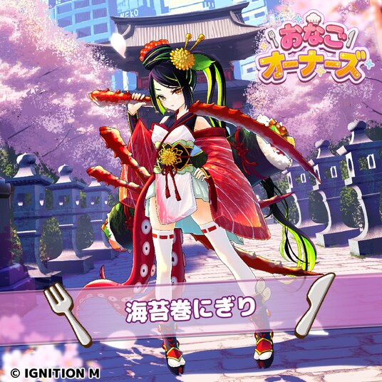 海苔巻にぎり紅と黒の花魁姿に身を包み、背には豪奢な寿司盛りと鋭い蟹脚を備えた、海鮮界の女傑。海の幸の力をまとい、握りの一撃で相手の心も胃袋も掴む。