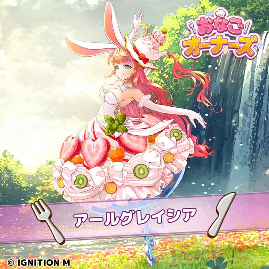 アールグレイシア優雅なティータイムと華やかなデザートをこよなく愛する、紅茶パフェ界のお嬢様。うさ耳付きの帽子には常にティーポットが乗り、立ち振る舞いはお菓子の国の舞踏会のように軽やか。