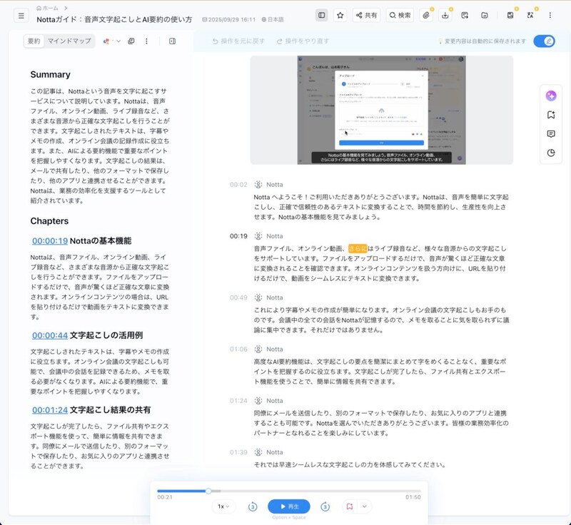 右の列が文字起こしで、左がサマリー。もし、固有名詞などで誤認識していたとしても、その部分だけを聞き直して修正することもできる。また話者も分離してくれる。