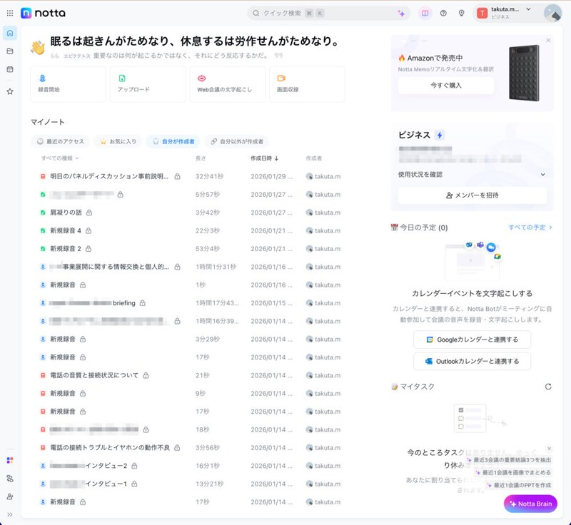 以前の文字起こしデバイスは、専門用語や、製品名などの固有名詞が認識できなかったが、NottaはAIを使うので、よほど新しい製品名でなければ認識してくれる。かなり便利だ。