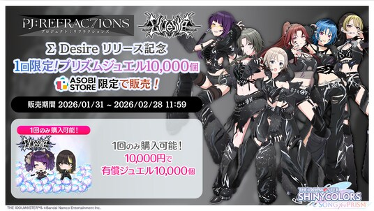 ただいま新ユニット Σ Desire の登場を記念して、「Σ Desire リリース記念 1回限定!プリズムジュエル 10,000個」をASOBI STORE限定で販売中です。