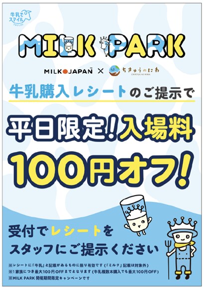 MILK PARK開催期間中の平日限定で、牛乳を購入したレシートをご提示いただくと、入場料が100円割引になるキャンペーンを実施します。