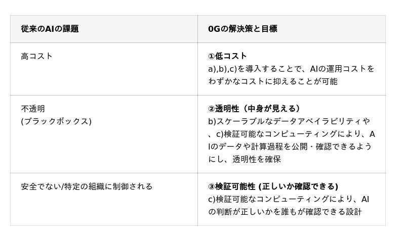 0G は、AIを特定の組織の支配下におかず、誰もが公平かつ安全にAIを利用できるようにすることを目指して設計された技術であり、1.低コスト、2.透明性、3.検証可能性の実現を目標としています。