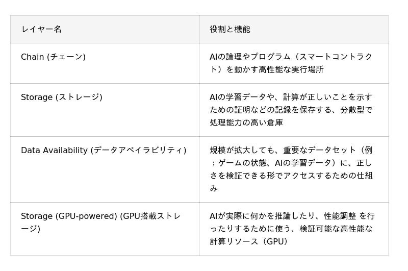 従来のAIの多くは、高コストで不透明かつ安全でないクローズドなブラックボックス内で実行されています。これに対し、0Gは、以下3つの主要な技術的な仕組みを組み合わせることで、上記目標を達成します。