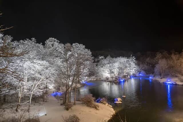 ゲストの入浴時間だったため夜は露天風呂からの撮影ができませんでしたが、真っ黒な夜空に純白の花が咲いたように木の枝に雪が積もり、幻想的で美しい風景を眺めることができました。厳冬期でも露天風呂に浸かっていれば温かで、眺望を満喫。雪景色の露天風呂はおすすめです。※写真は客室からの眺望