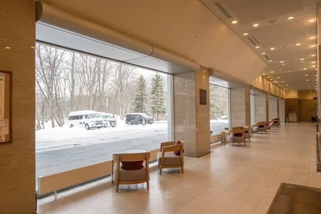 4階建ての低層の建物は日本を代表する建築家の黒川紀章の設計で、上空から見ると大沼に飛来する白鳥が翼を広げた外観デザインです。東西に広がる翼に相当する箇所が客室になっていて、廊下がカーブを描くとともに、窓からは外光が入り込み、森の木立を横目に客室へと向かいます。