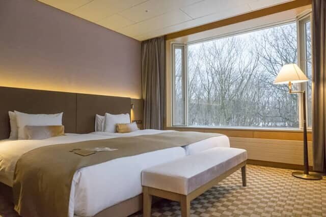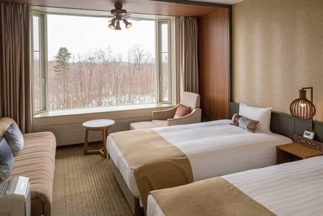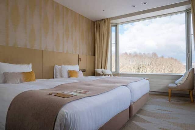 4階の「スーペリアツイン」はマウンテンサイドとフォレストサイドの2タイプの客室があり、眺望を楽しみたい人におすすめです。どちらも24.6平米の間取りに2台のベッドが置かれ、マウンテンサイドの客室には普段ソファーとして使えるエキストラベッドを備えた客室もありました。カーペットのデザインは、夏の大沼に彩りを添える白い花「睡蓮」です。