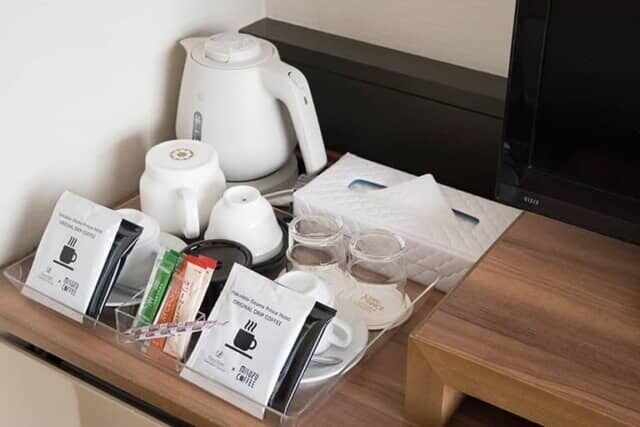 スーペリアツインには、モデレートタイプの客室よりワンランク上のアメニティが用意されます。函館を代表する老舗コーヒーチェーン『美鈴コーヒー』のドリップパックが置かれ、深炒りと浅炒りの2タイプをそろえます。