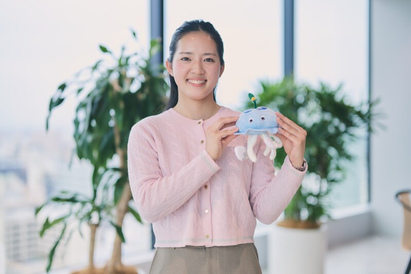 上原さんが手にしているのが、日本特殊陶業のオリジナルキャラクター「スイスイ」。