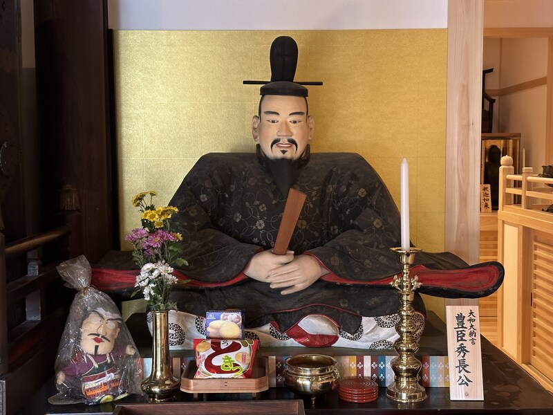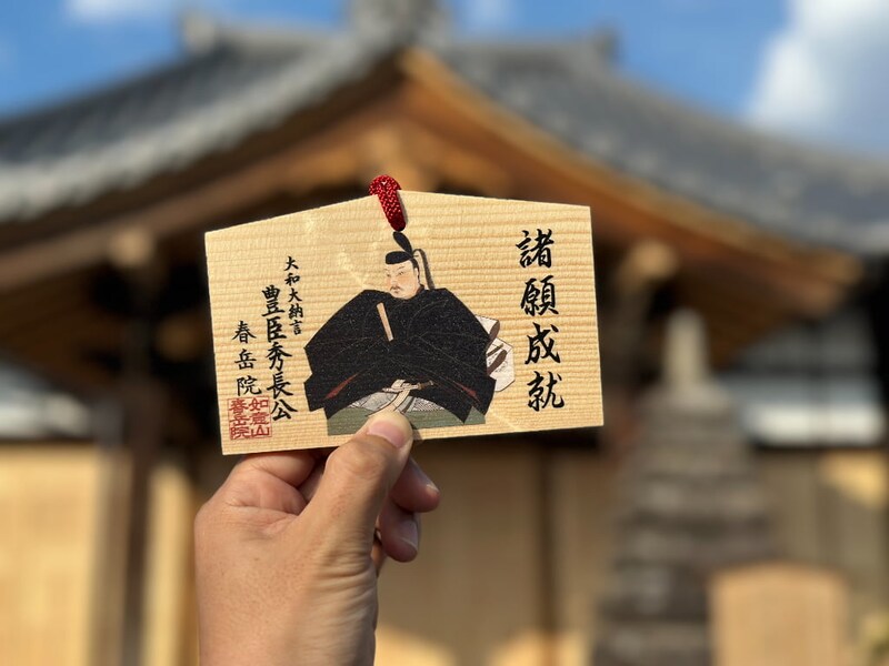境内には、江戸時代に描かれた秀長の肖像画をはじめ、秀長が定めた自治制度「箱本制度」に関わる資料や朱印箱が伝わり、近年奉納された秀長の木像も本堂に安置されています。現在は、秀長の450回忌(2040年)に向けて令和の大改修が進行中。新設の授与所では、絵馬や切り絵御朱印など、秀長にまつわる授与品も頒布されていますよ。