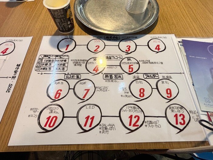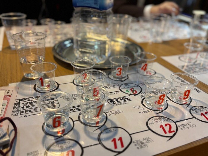 分類シートが手元に用意され、8種類に分類された日本酒と異なる3種のお酒をラベルの見方と、わかりやすい解説と共にテイスティング。