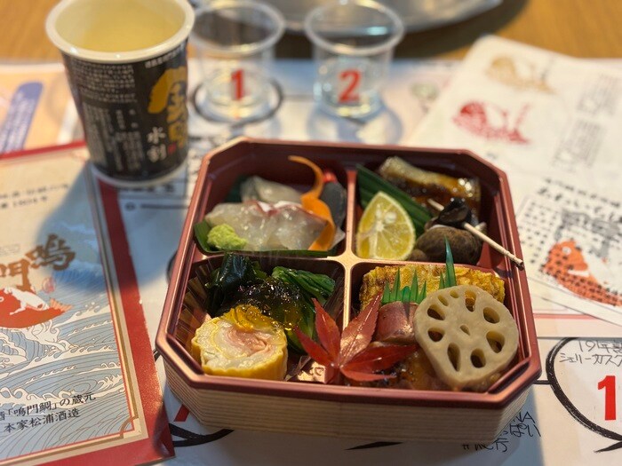 徳島食材の肴が詰まった「阿波の箱肴」と一緒に、テイスティングを楽しむ事ができます。(竹・五感で味わう日本酒探求コース)