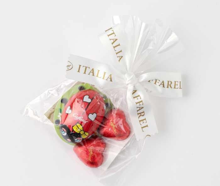 セット内容は、イタリアで幸運の象徴とされるてんとう虫とミニハートを組み合わせた計3粒のチョコレート。てんとう虫のホイルデザインは全3種類で、どのデザインが届くかはお楽しみです。